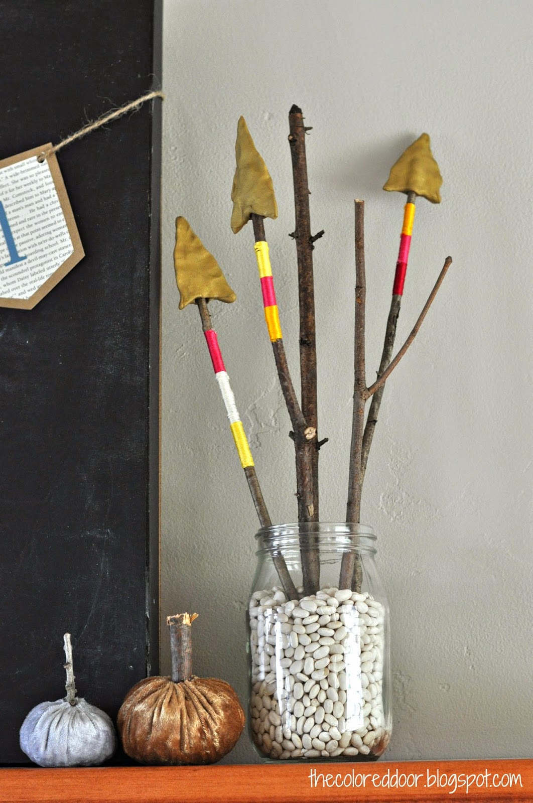 My favorite thing about this mantle are the DIY arrows! As soon as I saw them I knew I had to make them. Jenn over at My Fabulous Life made them. Aren't they awesome? So easy and fun. Just need some sticks, DMC thread, and clay ( I used gold oven baked clay so I could skip the spray painting).