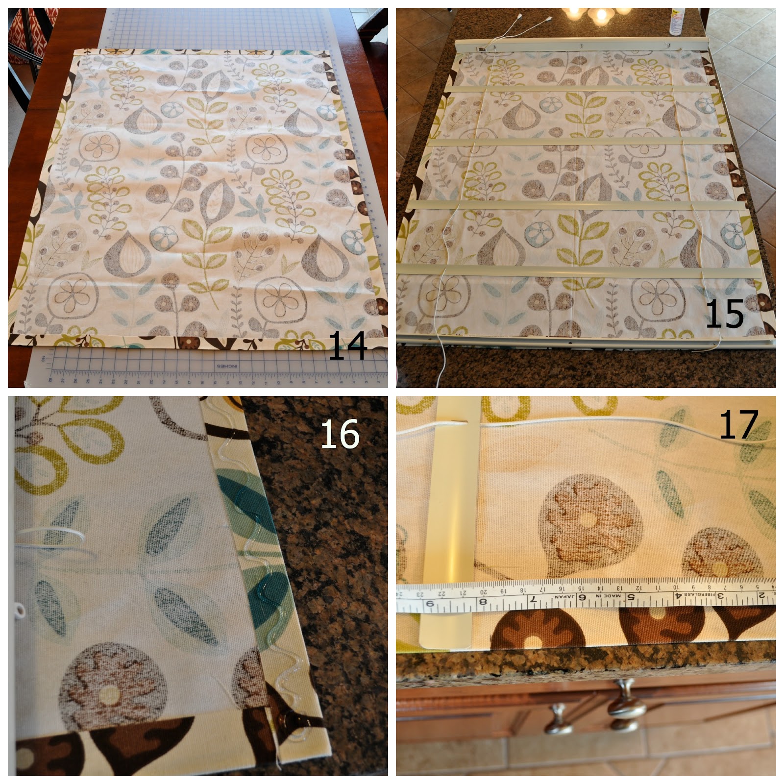 (14) Do that to all four sides. (15) The next step is to put your fabric face down on the floor or counter or where ever you are working and lay the blind on top of it. Make sure you lay the front of the blind down on the fabric. You can remove at least half of the slats from the strings. The slats should be about 7-9 inches apart depending on how big you want your folds and the length of your blinds. It would be nice if you had a number that divided evenly. We did not. We decided to space our slats a little less than 8 inches apart. I first spaced the slats out so I could see how they would look before gluing them down.
